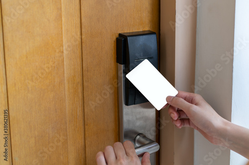 Door access control - woman hand holding white mockup key card to lock and unlock door. digital door lock.