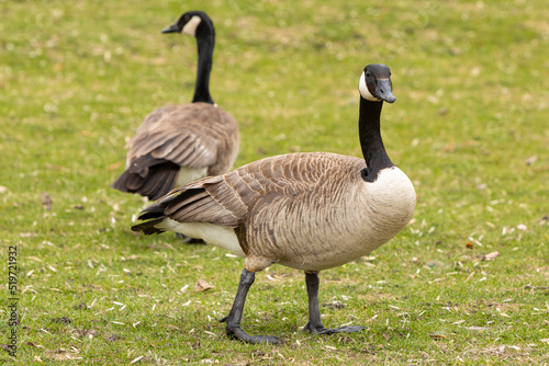 Dos (2) barnaclas canadienses (Branta canadensis) comiendo hierba en un prado verde