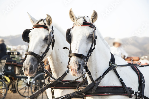 dos caballos blancos con arneses de carruaje