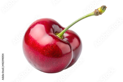 Double Delight: This heart-shaped, glossy red cherry, with its prominent stem and tender green leaf, exudes a charm and sweetness that speaks of a special treat.