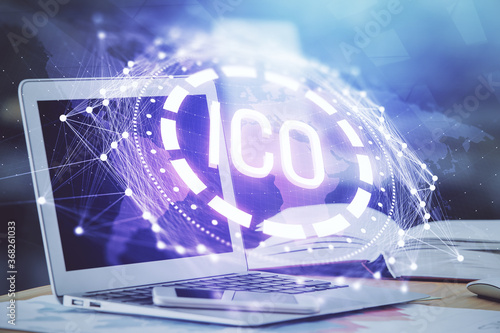 Double exposure of blockchain and crypto economy theme hologram and table with computer background. Concept of bitcoin cryptocurrency.