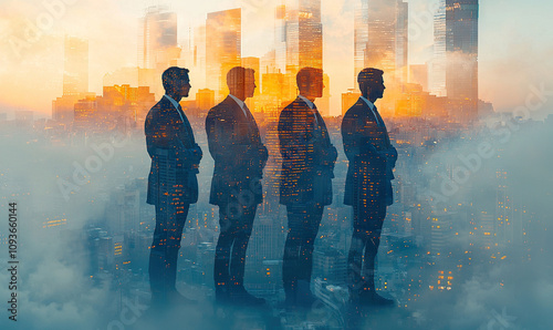double exposure of businessmen in suit sunset black and white in a city buildings