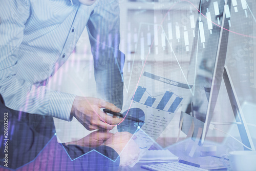 Double exposure of chart with businessman typing on computer in office on background. Concept of hard work.