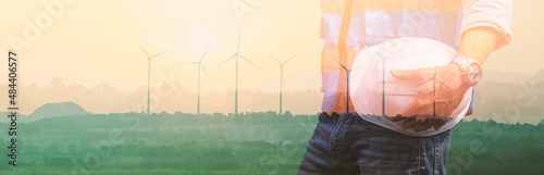 Double exposure of engineer holding helmet with wind turbine green energy plant backgrounds.