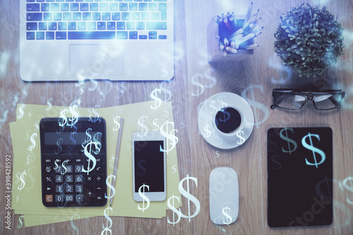 Double exposure of forex chart hologram over desktop with phone. Top view. Mobile trade platform concept.