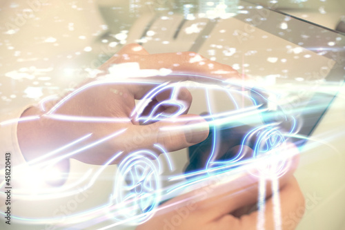 Double exposure of man's hands holding and using a digital device and automobile theme hologram drawing. Technology concept.