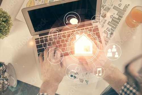 Double exposure of man's hands typing over computer keyboard and buildings drawing. Top view. smart city concept.