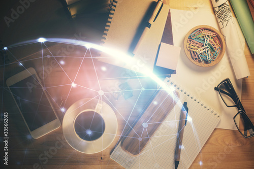 Double exposure of social network theme drawing and work table top veiw. Concept of international connection.