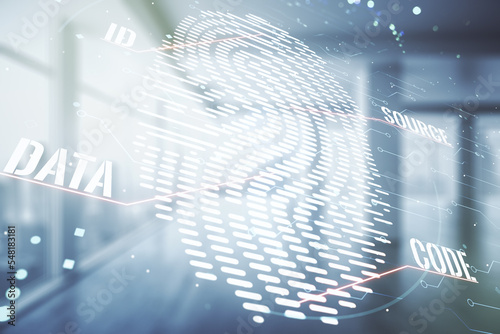Double exposure of virtual creative fingerprint hologram on empty room interior background, protection of personal information concept