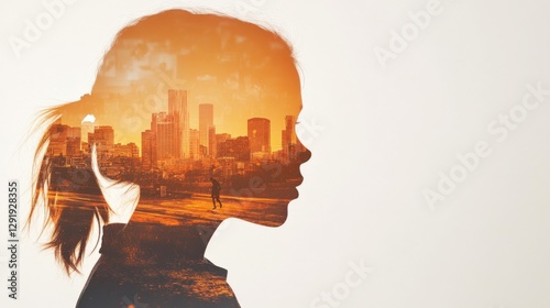 double exposure, silhouette, woman, city landscape, urban, conceptual, portrait, face, hair, building, skyline, horizon, person, abstract, modern, dream, thought, creative, artistic, illustration, graphic, design, city, female, young, background, orange