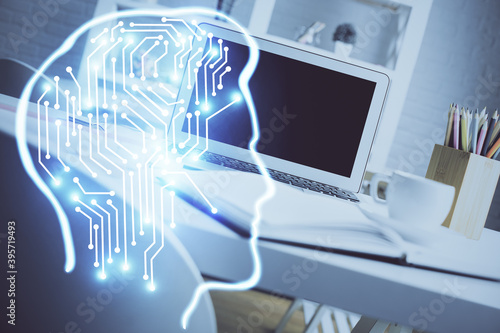 Double exposure of work space with computer and human brain drawing hologram. Brainstorm concept.