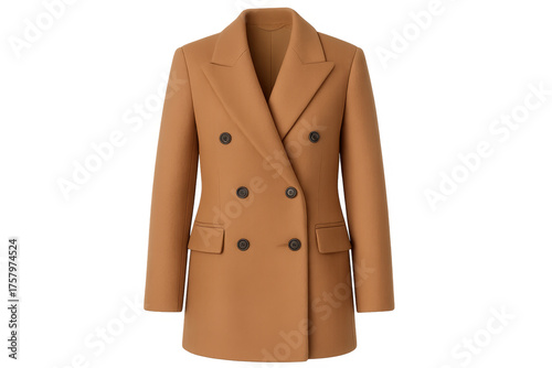double, breasted, coat, camel, wool, blazer, outerwear, jacket, apparel, garment, clothing, fashion, style, elegant, classic, casual attire, brown, warm, design, texture, fabric, textile, studio, shot, plain, cut-out, minimalist, no, people, product, merchandise, retail, shopping, commerce, flat, lay, presentation, clothes rack, autumn, fall, winter, cold, weather, business, transparent, background, isolated, white