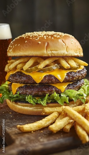 Double-Stacked Smash Burger Loaded with Cheese, Fries, and a Side of Cold Beer on Wooden Board