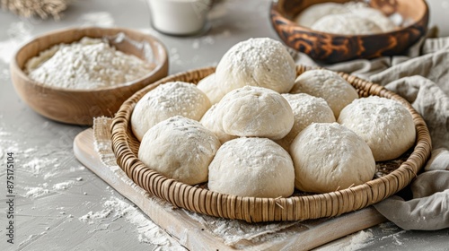 Dough Balls Ready For Baking in a Wicker Basket on a Floury Surface, Surrounded by Kitchen Ingredients