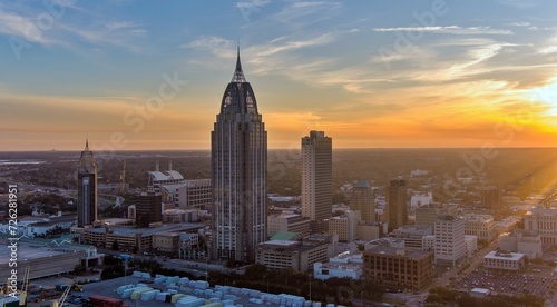 mobile, alabama, sunset, dusk, evening sky, city, city landscape, skyline, skyscraper, gulf coast, us, urban, port, river, building, town, downtown, waterfront, riverside, drone, aerial, aerial view, horizon, cloud, background, travel, architecture, landscape, tower, ship, container, barge, nautical vessel, harbor, dock, landmark, tour tourism, canal, america, winter, jan, mardi gras