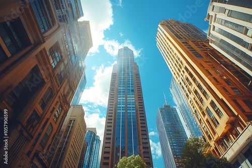 city, building, skyscraper, urban, architecture, tall, high, blue, sky, cloud, sunlight, day, city landscape, modern, office, business, window, glasses, concrete, steel, perspective, low angle, up, looking up, bright, vibrant, sunshine, city landscape, metropolis, center, downtown, surface level, view, vertical, geometric, clear, clean, midday, sunbeam, shadow, light, contrast
