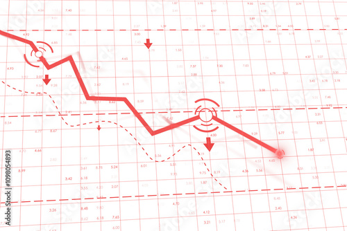 Downward red trend line on grid chart with arrows and data points, isolated on white background. Concept of financial or business downturn. 3D Rendering.