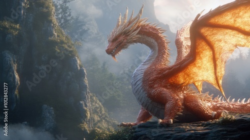 dragon, mythical, creature, fantasy, mountain, wing, scale, rock, forest, cliff, landscape, nature, mythology, legend, snake, beast, powerful, ancient, fierce, sky, fire, magic, mystical, legendary, epic, whimsical, fable, imagination, dreamlike, artwork, digital, art, illustration, concept, three-dimensional, rendering, colours, gold, red