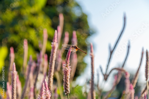 Dragonfly perched on a flower in the evening, preparing for a last meal and accommodation before dark.
