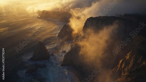 dramatic aerial view of california coastal landscape sweeping panorama capturing golden hour light as fog rolls over rugged cliffs and pacific waves below