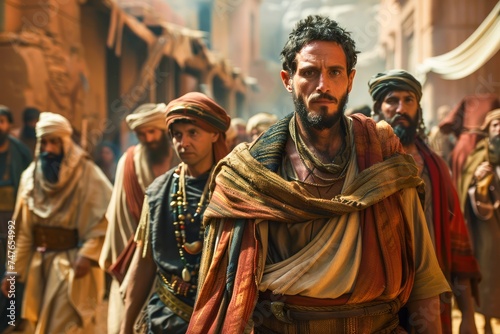 Dramatic Ancient Marketplace Scene with Focused Man in Traditional Garb Amongst Bustling Crowd