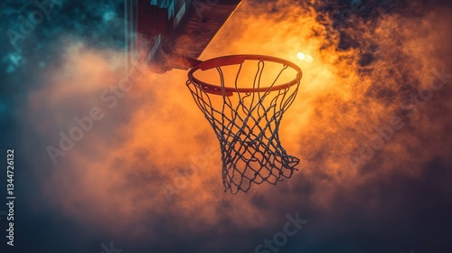 basketball, hoop, net, smoke, dramatic, night, sport, game, court, victory, competition, score, shot, dunk, withering, light, orange, yellow, dark, fog, misty, atmosphere, intense, passion, action, sportsmanship, excitement, sharpened, skill, athletic, performance, gameplay, basketball court, powerful, winning, success, challenging, motivation, closeup, detail, intensity, energy