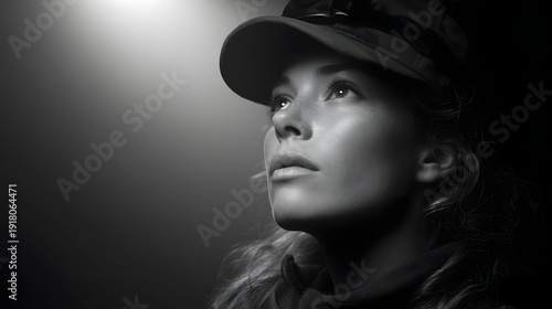 Dramatic black and white close up of a woman wearing a cap looking upwards with intense lighting