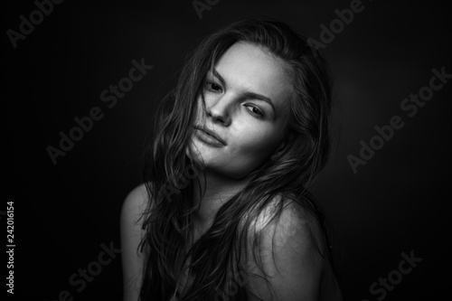 Dramatic black and white portrait of a beautiful girl on a dark background