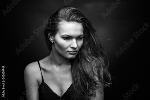 Dramatic black and white portrait of a beautiful girl on a dark background