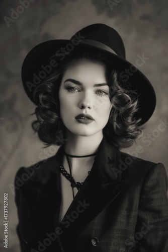 Dramatic black and white portrait of a stylish retro woman in 1950s fashion.