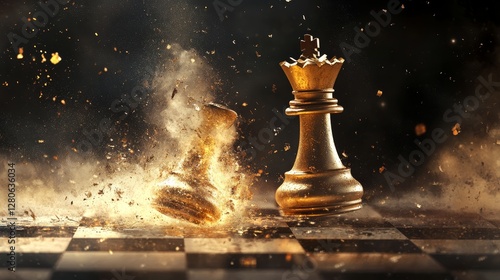 Dramatic chess piece explosion, intense collision, shattered chessboard