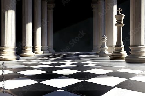 Dramatic Chessboard Hallway with Classical Columns, Giant Chess Pieces, and Dynamic Lighting Effects