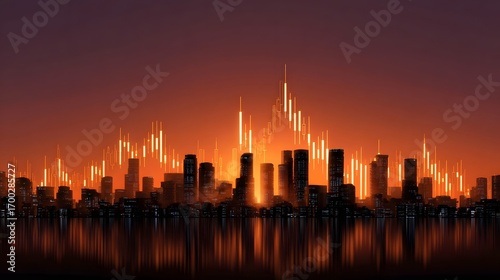 city landscape, skyline, sunset, light, downtown, urban, skyscraper, water, architecture, modern, city, glow, finance, business, commercial, illumination, orange, yellow, red, landscape, silhouette, mirrored, symmetry, vibrant, dramatic, atmospheric, futuristic, illuminated, metropolitan