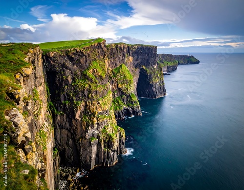 Dramatic cliffs meet the sea under a partly cloudy sky
