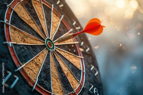 Dramatic close-up of a dart hitting the bullseye with a single vibrant red arrow, symbolizing perfect aim and achievement