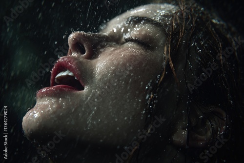 Dramatic close-up of woman in rain, experiencing emotional release and freedom, water droplets on face, dark background, concept of cleansing, rejuvenation, and raw human emotion