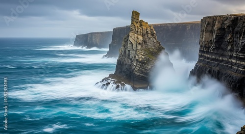 Dramatic coastal landscape with powerful waves crashing against jagged cliffs in Ireland