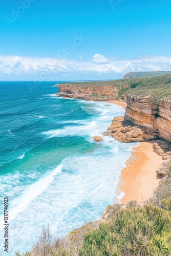 Dramatic coastline with crashing waves and untouched golden sands along a deep blue ocean under a bright sky