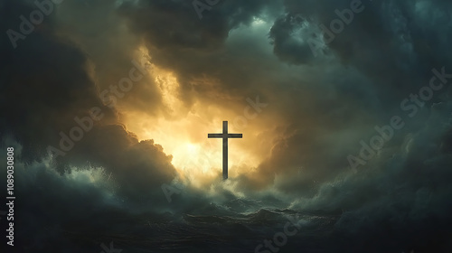 cross, silhouette, cloud, wave, storm, dramatic, light, ocean, sky, religious, faith, nature, dark, background, spirituality, hope, contrast, sea, thunder, atmosphere, powerful, serene, landscape, horizon, water, beauty, peace, light rays, spiritual, symbol, belief, calmness, divine, majestic, storm cloud, atmospheric, emotional, inspirational