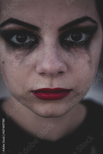 Dramatic female portrait with tears and red lipstick. Beautiful female portrait with runny makeup. Crying woman with smudged makeup and red lipstick.