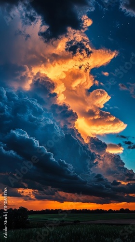 Dramatic golden clouds emerging at sunset over green field