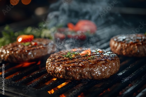 Dramatic Image of Burger Patties Sizzling on Grill with Smoke and Fresh Toppings