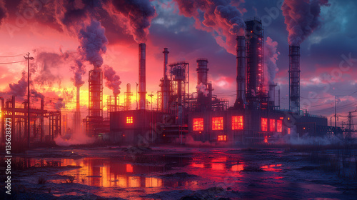 refinery, industrial, sunset, smoke, pollution, factory, glowing, dramatic, puddle, smokestack, power plant, infrastructure, environmental, urban, energy, atmospheric, fiery, twilight, machinery, pipe, silhouette, landscape, futuristic