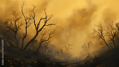 dramatic, landscape, forest, wildfire, smoke, charred, tree, moody, sky, ashen, illustration