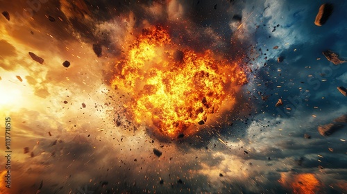 explosion, fire, smoke, debris, damage, blast, cloud, chaotic, destruction, bright, orange, intense, visual, energy, force, nature, dramatic, scene, background, weather, danger, impact, landscape, high-coloured, contrast, atmosphere, cinematic, nuclear, violent, spectacle, environment, flames, chaos, particle, shock, earth, dangerous, light, heat, aerial, night, day, colours