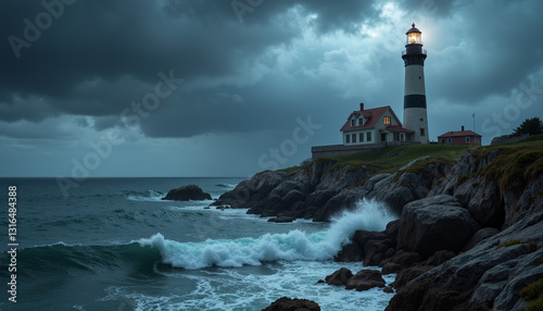 Dramatic lighthouse illuminating stormy seas at twilight, maritime beauty