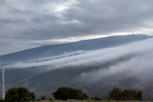 Dramatic mountain peaks during winter low cloud coverage, in the mountainous region of Kissavos, near Larissa town, in central Greece, GREECE, EUROPE.