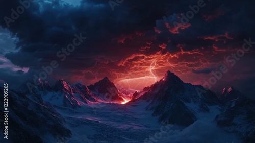 dramatic mountain range under stormy sky with vivid lightning, bold and dynamic composition, powerful and artistic focus, intense and atmospheric scene