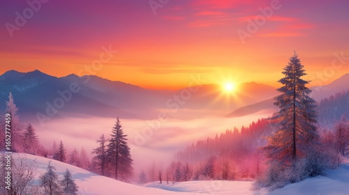 Dramatic mountain view at sunrise with fresh snow and swirling fog creating an ethereal, cinematic scene