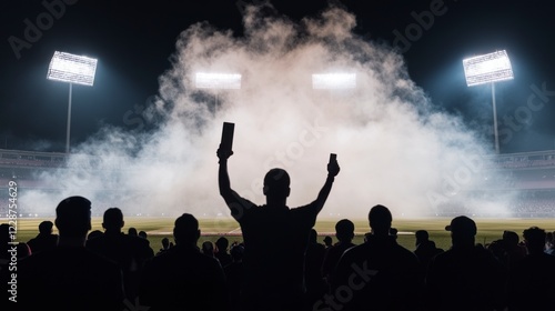 stadium, night, crowd, smoke, light, celebration, sport, event, game, spectator, silhouette, fan, cheering, excitement, energy, atmosphere, arena, competition, action, spectacle, performance, background, texture, dark, bright, shadow, mystery, suspense, thrill, passion, victory, happiness